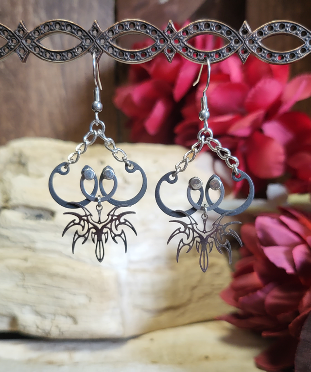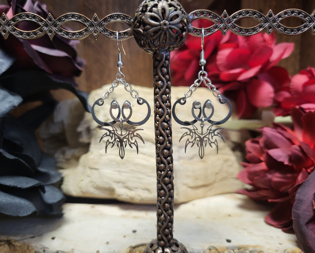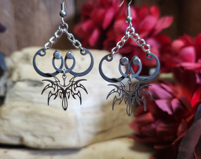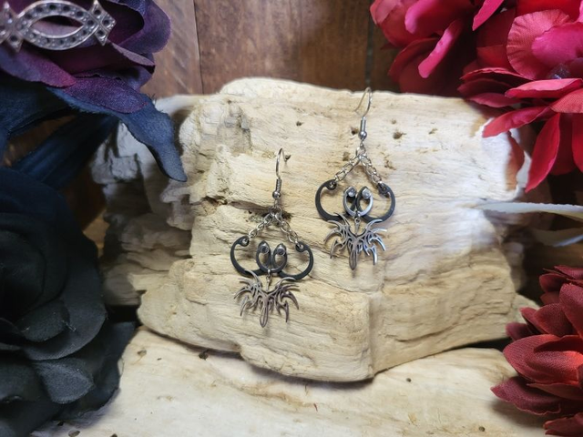Ces boucles d’oreilles allient circlips industriels et breloques en forme d’épée-araignée, symbole d’une beauté à la fois mécanique, organique pour un envoûtant et singulier.