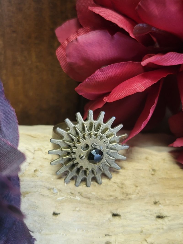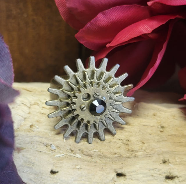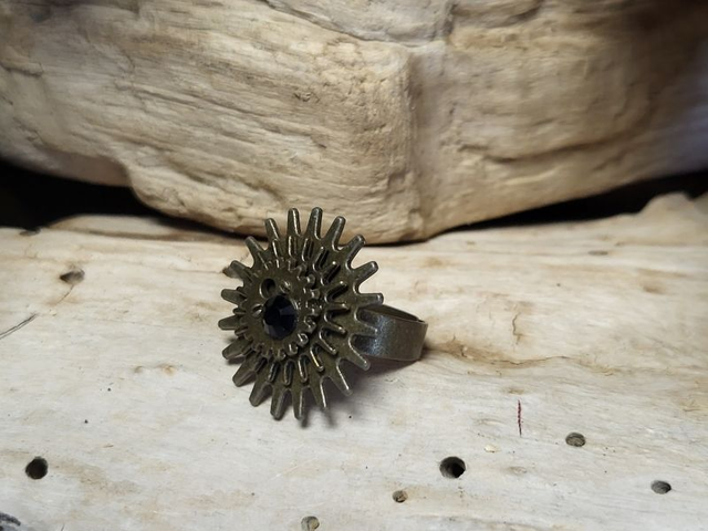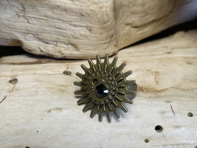 Bague réglable en acier couleur bronze ornée de breloques en forme d'engrenage avec une perle noire au centre.